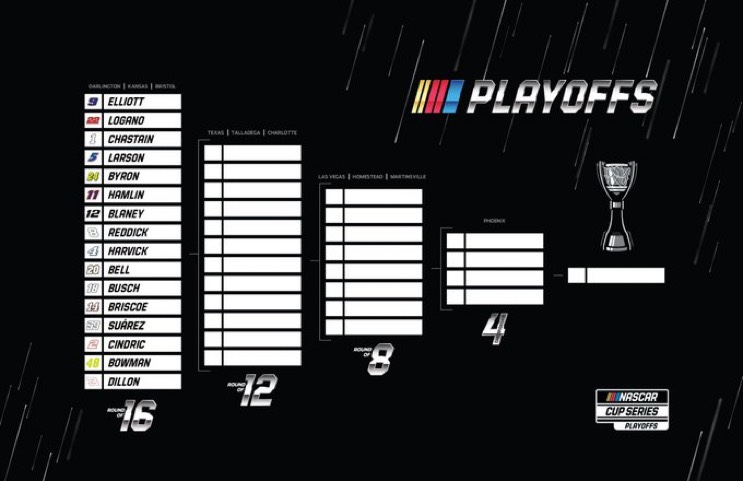 So let’s meet the field (in no particular order). Austin Cindric* (Daytona 500 champ), Kyle Larson (defending series champ), Chase Elliott (regular season champ), Denny Hamlin, Kyle Busch, Tyler Reddick, Ross Chastain*, Austin Dillon, Chase Briscoe*, Daniel Suarez*, Joey Logano, Ryan Blaney, William Byron, Christopher Bell, Kevin Harvick, and Alex Bowman.